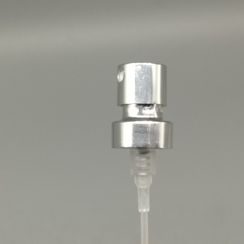 A premium mechanical dispensing system designed specifically for luxury fragrance bottles. This high-precision pump features an external actuator, internal pump chamber, dip tube, and mounting ferrule. When pressed, it draws liquid fragrance from the bottle and atomizes it through a micro-engineered nozzle into a delicate, consistent mist. The secure crimp seal prevents evaporation, preserving the fragrance's complete scent profile from top to base notes.